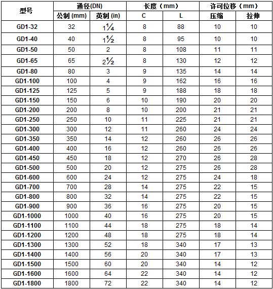 可曲挠 橡胶接头规格(涵盖主要技术规格参数、外形尺码、产品型号、通径( DN) 、公制( mm) 、英制( in) 、长度( mm)、许多位移( mm) 、压缩、拉伸等核心精准数据)详情如下: