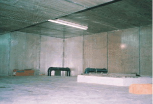 治理内容: 地下一层水箱房四周内壁和顶面安装吸声结构,控制噪声向楼层居民住房内的传递。治理效果: 实测楼面一层居民住房内噪声指标37dB(A),降噪9分贝。